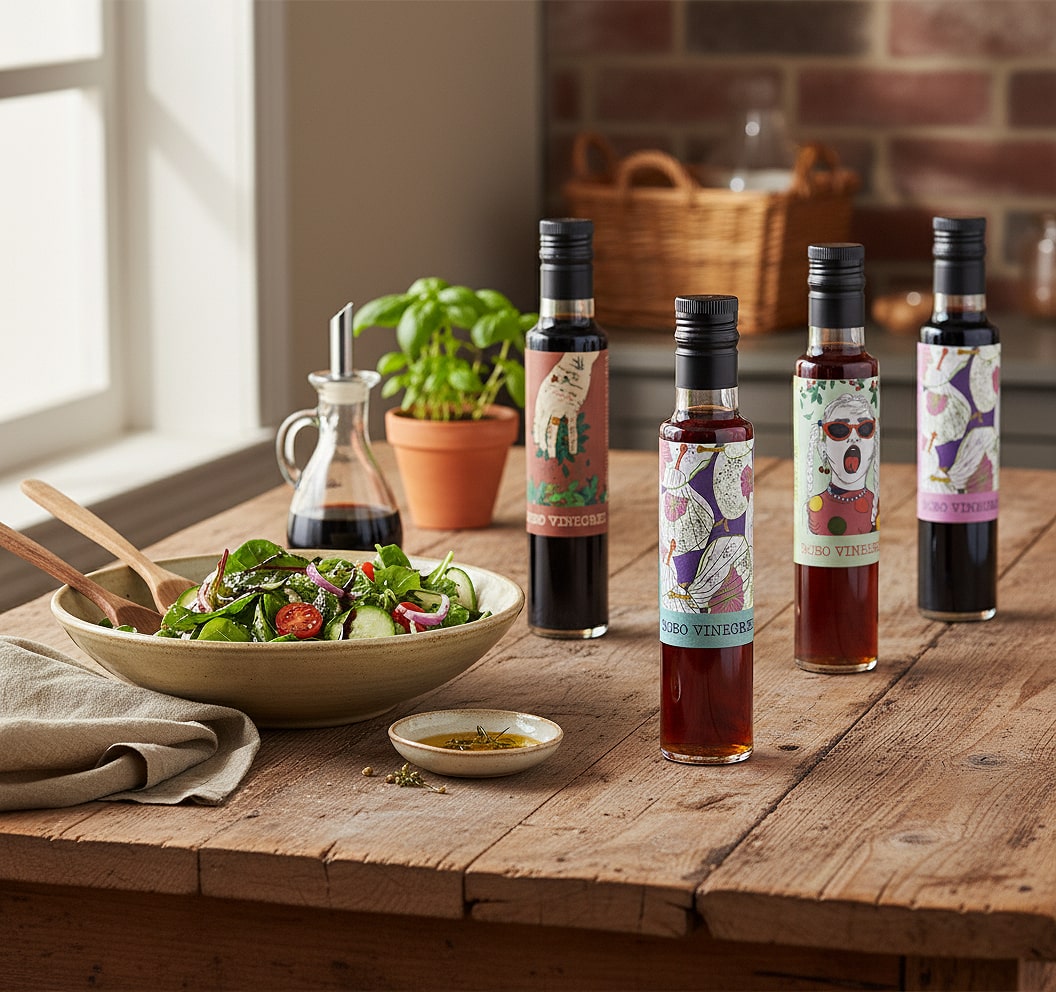 A Bobo Vinegret egy újragondolt, 100%-ban vegán vinaigrette, amely egyszerre fűszer, sav és egészséges kiegészítő. Termékünk a konyha izgalmas eleme, amely kiemeli az ételek ízét, miközben jót tesz a testednek is. Fedezd fel velünk újra a vinaigrette világát – természetesen, ízletesen, tudatosan!